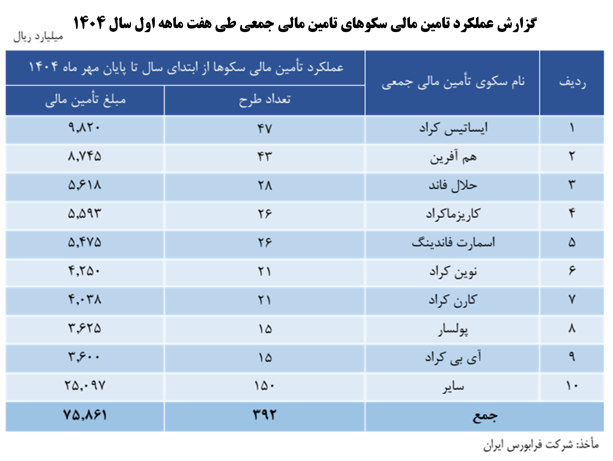 ارزش تامین مالی انجام شده از طریق “سکوهای تامین مالی جمعی” طی هفت ماهه اول سال 1404 رقمی معادل 75،861 میلیارد ریال بوده است.