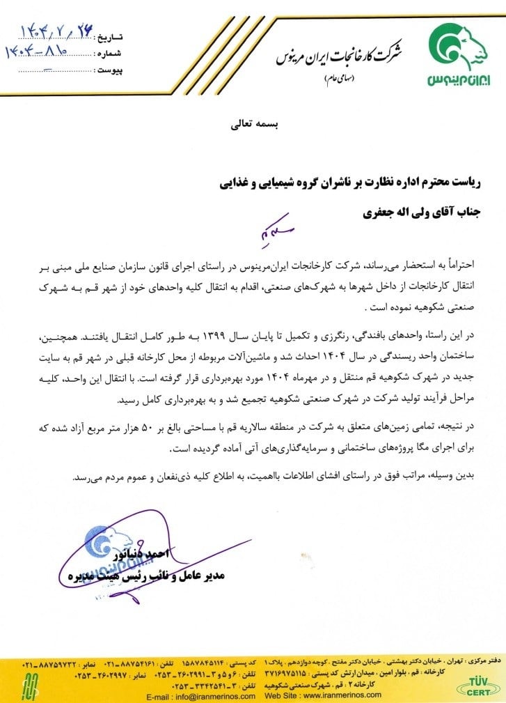 نمرینو در این خصوص اظهار داشت در راستای اجرای قانون سازمان صنایع ملی مبنی بر انتقال کارخانجات از داخل شهرها به شهرکهای صنعتی اقدام به انتقال کلیه واحدهای خود از شهر قم به شهرک صنعتی شکوهیه نموده است.