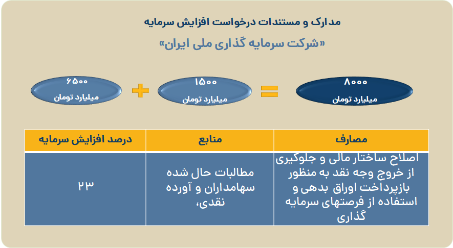 هدف از این افزایش سرمایه، اصلاح ساختار مالی شرکت، کاهش نسبت بدهی به حقوق صاحبان سهام و جلوگیری از خروج وجه نقد به منظور بازپرداخت اوراق بدهی عنوان شده است. به این ترتیب سرمایهگذاری ملی ایران میتواند منابع داخلی خود را برای استفاده از فرصتهای جدید سرمایهگذاری و توسعه پرتفوی بورسی و غیربورسی به کار گیرد.