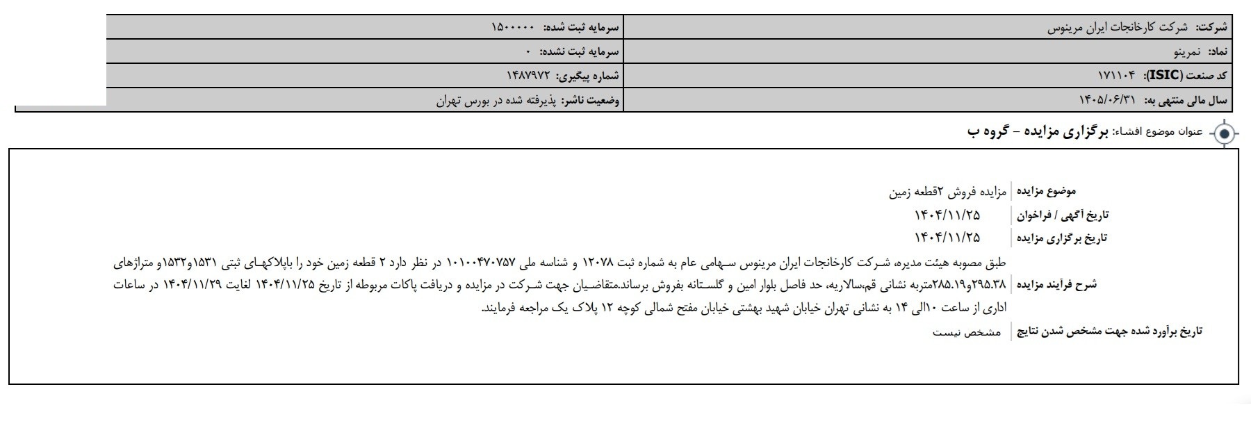 شرکت کارخانجات ایران مرینوس در نظر دارد 2 قطعه زمین خود را باپلاکهای ثبتی 1531و1532و متراژهای 295.38و285.19متربه نشانی قم،سالاریه، حد فاصل بلوار امین و گلستانه بفروش برساند.