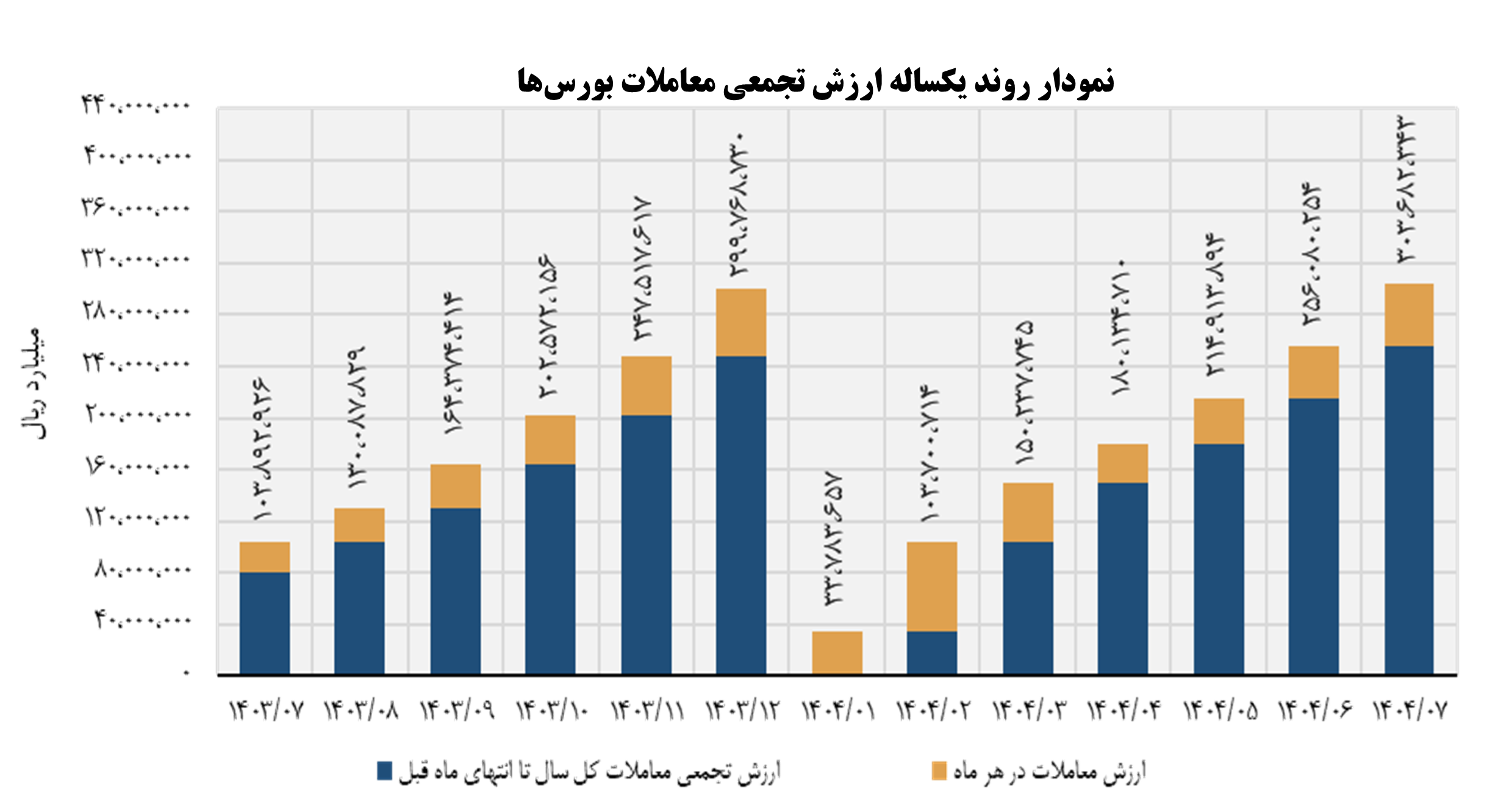 مجموع تجمعی ارزش معاملات بازارها در بورس اوراق بهادار منتهی به 7 ماهه اول سال 1404، رقمی معادل ۳۱۸,۳۸۱,۶۶۸ میلیارد ریال و میانگین روزانه ارزش معاملات بالغ بر ۲,۲۷۴,۱۵۵ میلیارد ریال بوده است. مجموع ارزش معاملات بازارها در یک ماهه مهر1404، رقمی معادل ۴۷,۶۰۲,۰۸۹ میلیارد ریال بوده است؛ که نسبت به ماه قبل (شهریور 1404) حدود 15/63 درصد افزایش داشته و نسبت به ماه مشابه سال قبل (شهریور1403) حدود 103/13 درصد افزایش داشته است. میانگین روزانه ارزش معاملات بازارها طی بازه مذکور نیز رقمی معادل ۲,۱۶۳,۷۳۱ میلیارد ریال میباشد.