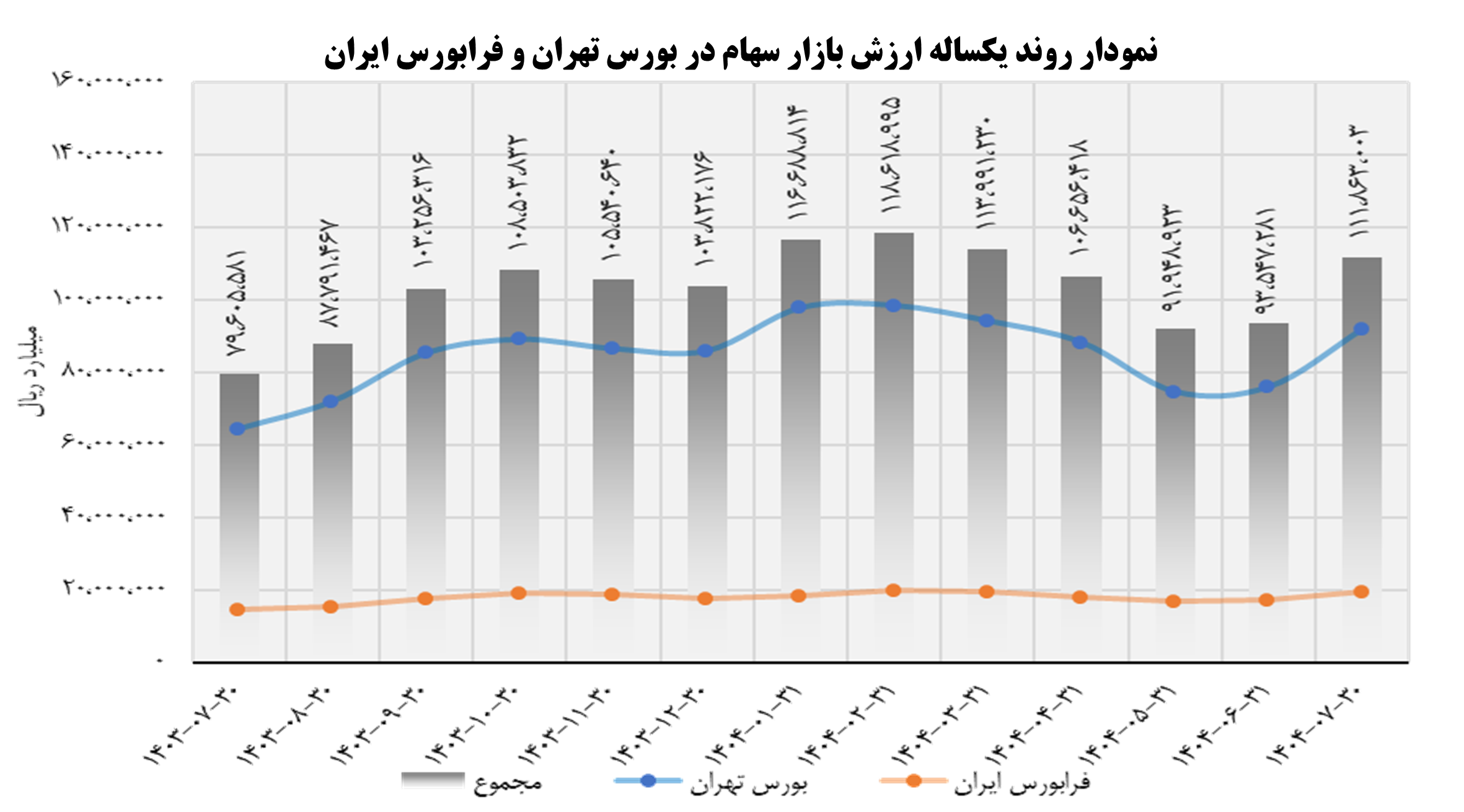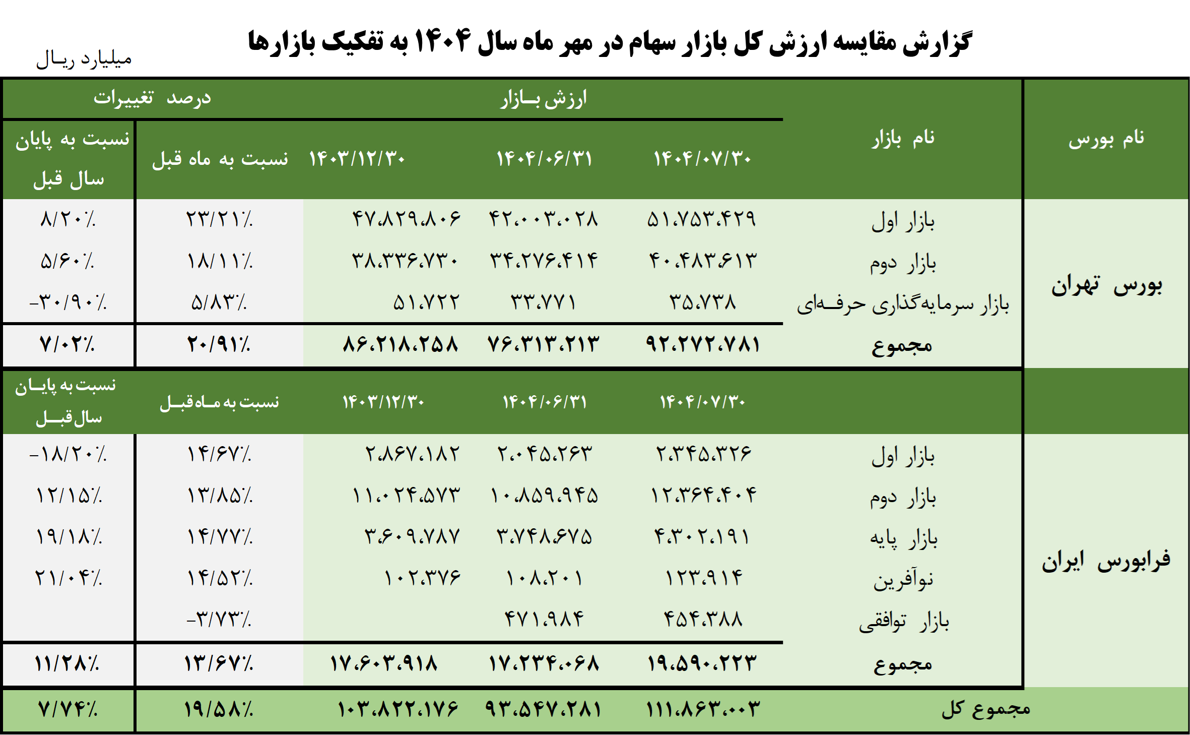 مجموع ارزش کل سهام در بورس اوراق بهادار تهران و فرابورس ایران در یک ماهه مهر 1404، رقمی معادل ۱۱۱,۸۶۳,۰۰۳ میلیارد ریال بوده است؛ که نسبت به ماه قبل (شهریور1404) حدود 19/58 درصد افزایش داشته و نسبت به سال گذشته (1403/12/30) حدود 7/74 درصد افزایش داشته است.
