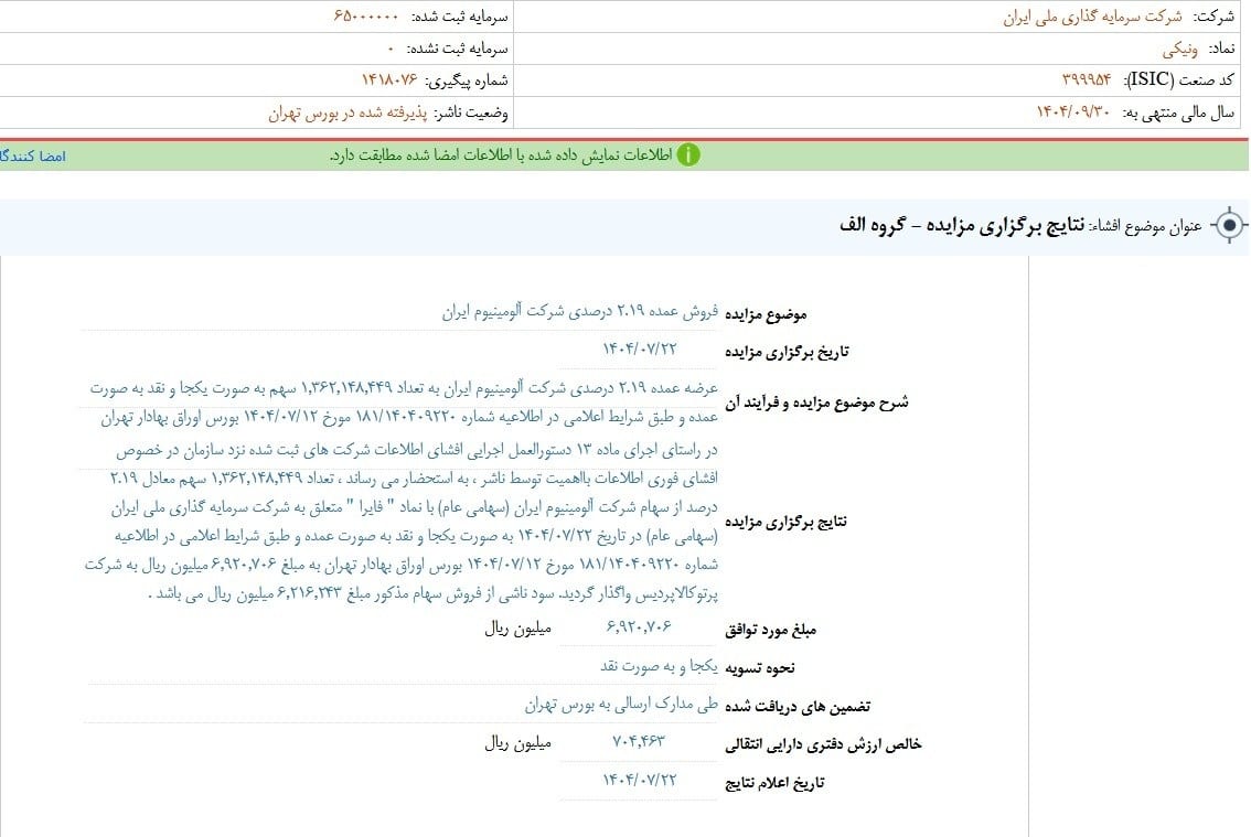 شرکت سرمایهگذاری ملی ایران طی اطلاعیهای در سامانه کدال، از فروش بخش قابل توجهی از سهام خود در شرکت آلومینیوم ایران (فایرا) خبر داد.