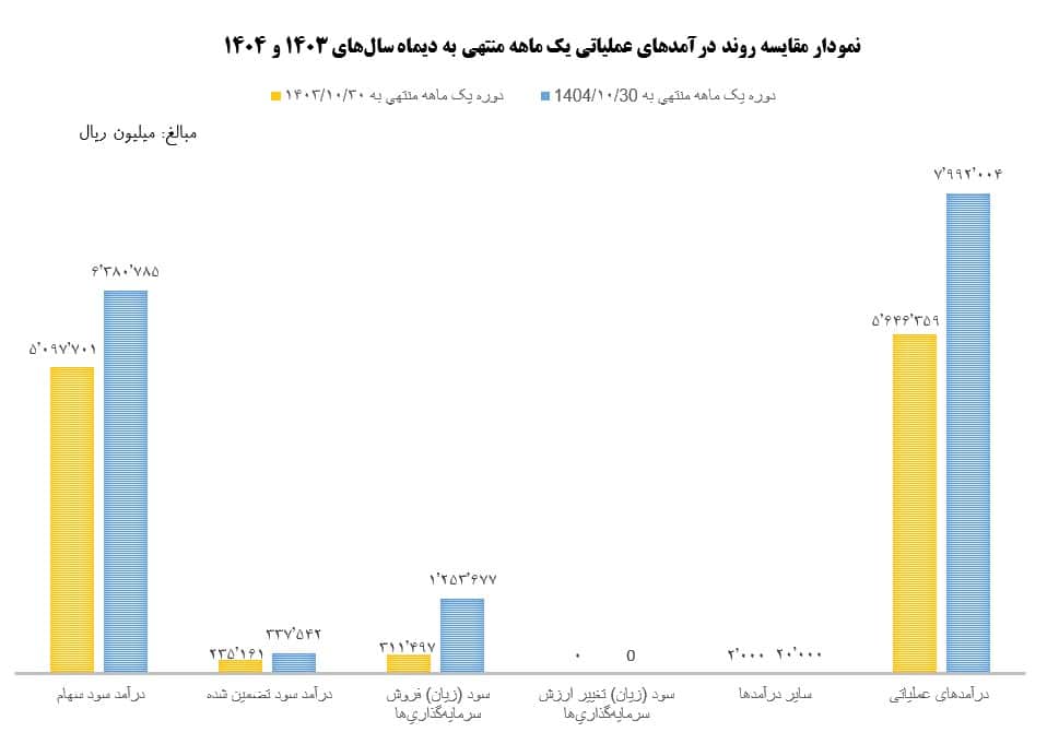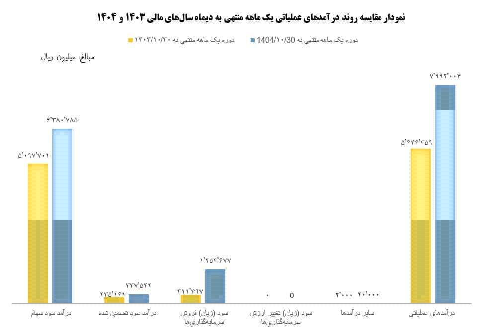 لازم به ذکر است حدود 80 درصد از درآمدهای عملیاتی یک ماهه این دوره (یعنی رقمی معادل ۶,۳۸۰,۷۸۵ میلیون ریال)، از محل “درآمد سود سهام” بوده است، که بیانگر کیفیت بالای پرتفوی سرمایهگذاری و انتخاب هدفمند شرکتهای سرمایهپذیر با توان سودآوری پایدار است. این موضوع همچنین حاکی از مدیریت کارآمد داراییها و بهرهبرداری موثر از بازده نقدی سرمایهگذاریها در زمانبندی مناسب است که نقش مهمی در افزایش نقدینگی و انعطافپذیری مالی شرکت ایفا میکند.