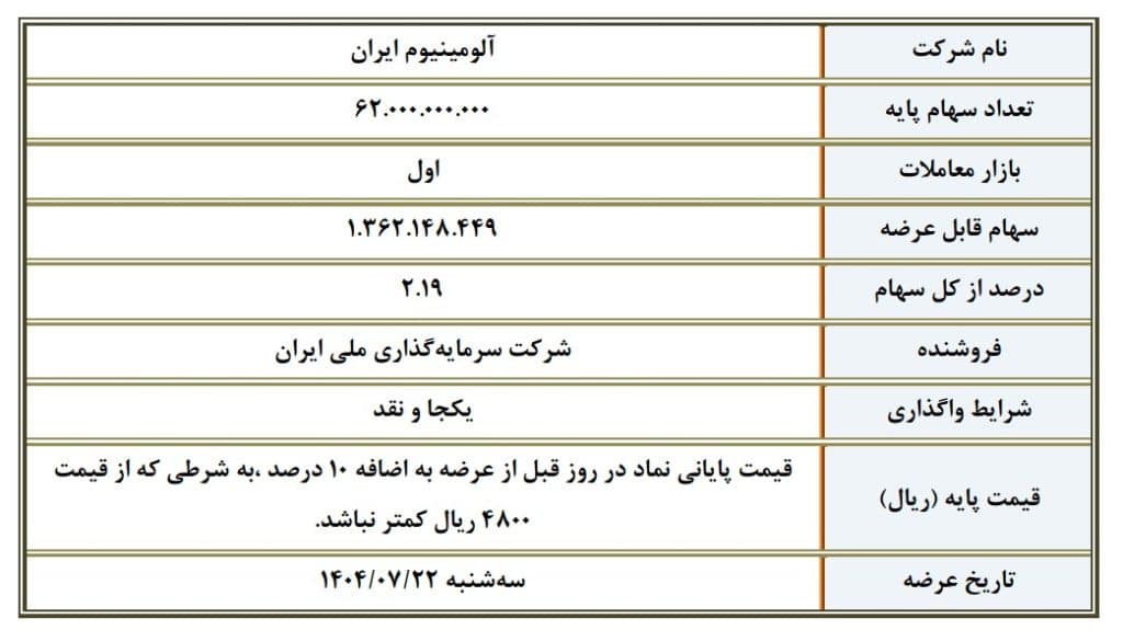 Yadegari 0 دیدگاه آرشیو اخبار, اخبار, برگزیده اخبار ونیکی 14 مهر 1404 14 مهر 1404 عرضه عمده بلوک ۲.۱۹ درصدی سهام شرکت آلومینیوم ایران توسط شرکت سرمایهگذاری ملی ایران شرکت سرمایهگذاری ملی ایران (سهامی عام) با نماد «ونیکی»، در راستای اجرای دستورالعمل اجرایی افشای اطلاعات شرکت... ادامه مطلب